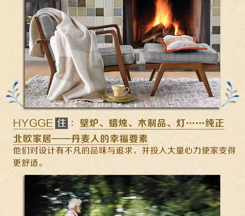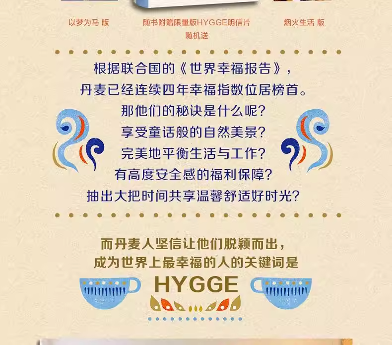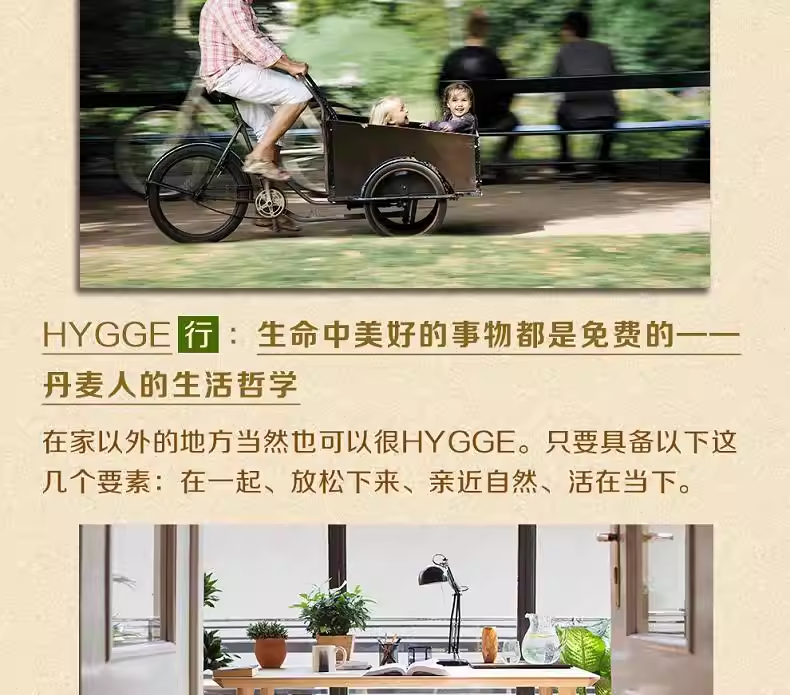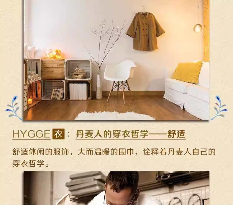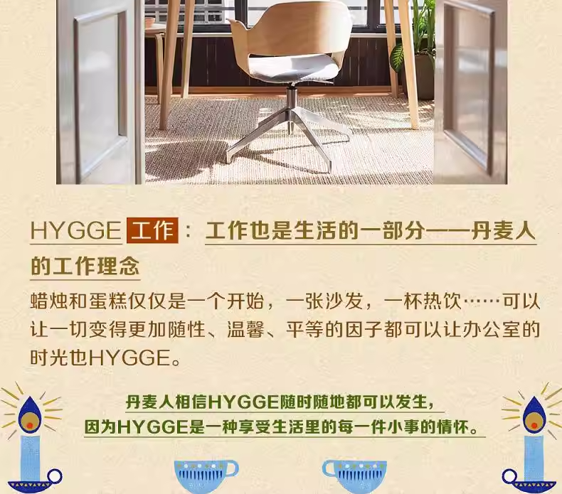 2. HYGGE一词无法翻译,但它确实就是我们想要的美好生活。HYGGE是被丹麦人“灵魂演绎”的一种生活哲学——舒适慢活的生活方式,一种有质感的舒服和轻松愉悦的群体氛围,从中产生满足感和幸福感。它可以大致描述为舒适和满足的感觉,灵魂的亲密,当下的快乐,以及一切美好的人与事。本书名保留它的原单词,并使用书名《丹麦人为什么幸福》。
