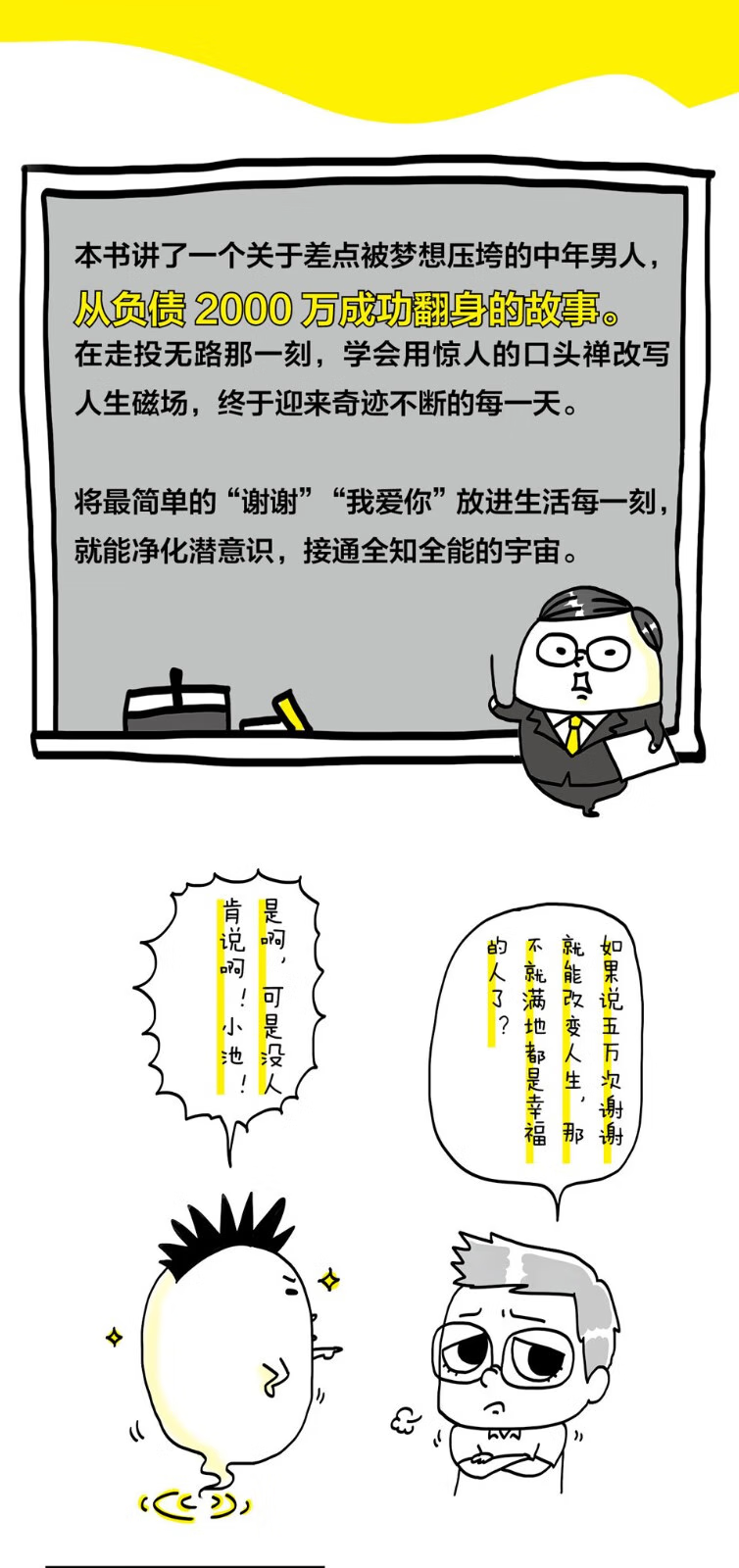 本书讲了一个关于差点被梦想压垮的中年男人,从负债2000万成功翻身的故事。在走投无路那一刻,学会用惊人的口头禅改写人生磁场,终于迎来奇迹不断的每一天。作者不谈复杂理论,只要你改变平时说话习惯,活用15句口头禅,就能化解困局,迎来奇迹,让人生根基产生转变。比如说,将最简单的“谢谢”“我爱你”放进生活每一刻,就能净化潜意识,接通全知全能的宇宙。如果看过《秘密》或《吸引力法则》,还是不知如何心想事成,这本趣味盎然又寓意深刻的中年大叔翻身记,能让人立即明白心想事成的操作步骤。本系列累销销量超过20万册,在YouTube 有近百个专题演讲或采访视频。