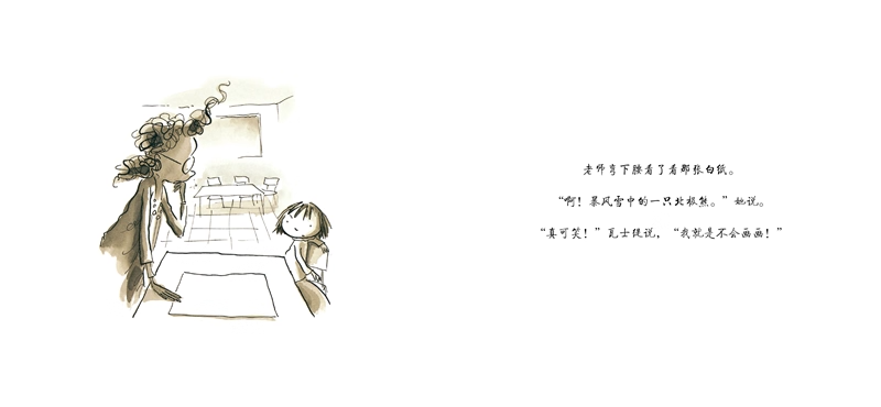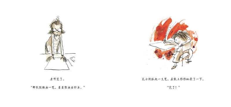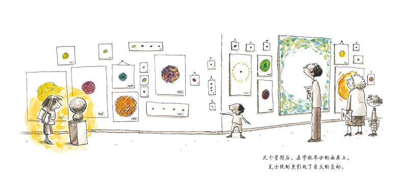 《点》的故事中,瓦士缇也遇到了一位“教孩子”而不是“教书或教美术”的好老师。她仔细研究这一“点”想要表达的情绪和内容,发自内心地欣赏孩子的作品。正是从老师真心的认同中,瓦士缇得到了*好的鼓励。原来好的作品不是画得怎样来获得别人的认同,重要的是表达自己。