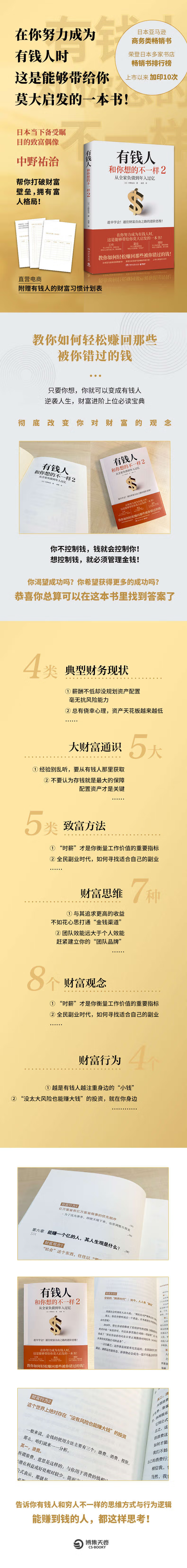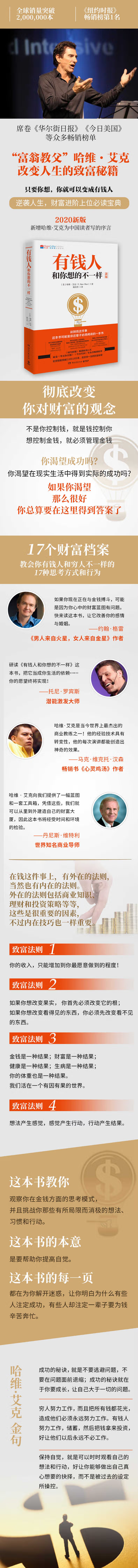 5.有钱人的想法,真的与穷人,甚至和生活小康的人都不一样。从如何规划财富蓝图到财富法则的实现,17个财富档案,看清有钱人和穷人不一样的17种思考方式和行为。只要你想,你就可以成为有钱人。